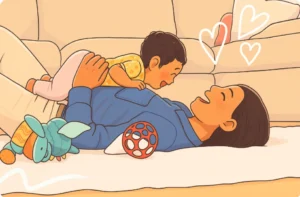 タミータイムとは、大人が仰向けに寝た状態で胸の上に赤ちゃんをうつ伏せにして寝かせる時間のことをいい、赤ちゃんの呼吸を目で確認したり、肌で感じることができ安全にうつ伏せにできることがメリットです。