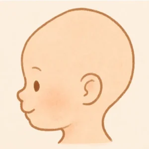 一方で、おでこの骨にあたる前頭骨は、骨としては平坦な構造をしており、眉の上から上に向かって比較的まっすぐに立ち上がるような形をとります。また、この時期は顔面の骨格、たとえば頬骨や眉の骨がまだ十分に発達していないため、顔全体が下の方に小さくまとまり、額から頭にかけての丸みがより目立って見えるのです。