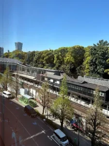 クリニック西側から見える原宿駅と明治神宮の杜