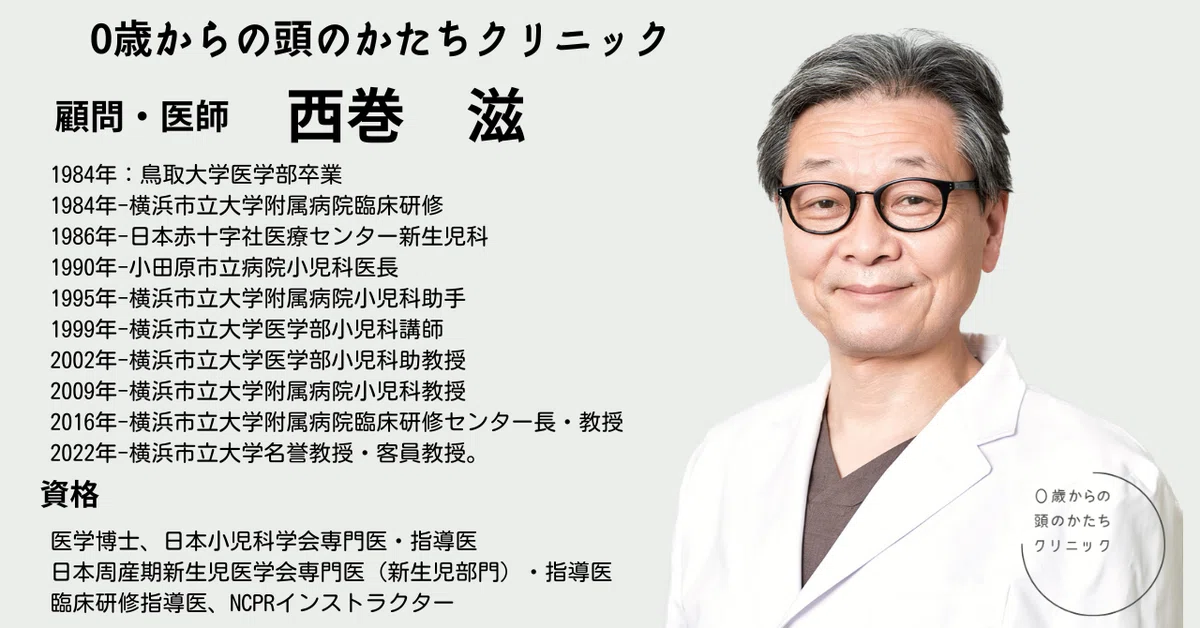 2022年4月から、0歳からの頭のかたちクリニック東京でヘルメット矯正治療に携わっております西巻です(月曜日に外来を担当)。2022年3月に定年で退職するまでに大学病院で新生児や小児の診療をしておりました。診療の場に違いはありますが、新しい医療に関わることができ、嬉しく思います。